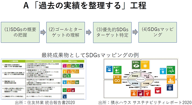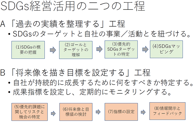 その上で、SDGsを実践するための具体的な方法として、大きく「A 過去の実績を整理する」「B 将来像を描き目標を設定する」という2つの工程を紹介し、さらにその2つをさらに詳細なステップに分解する手法を提示していただきました。