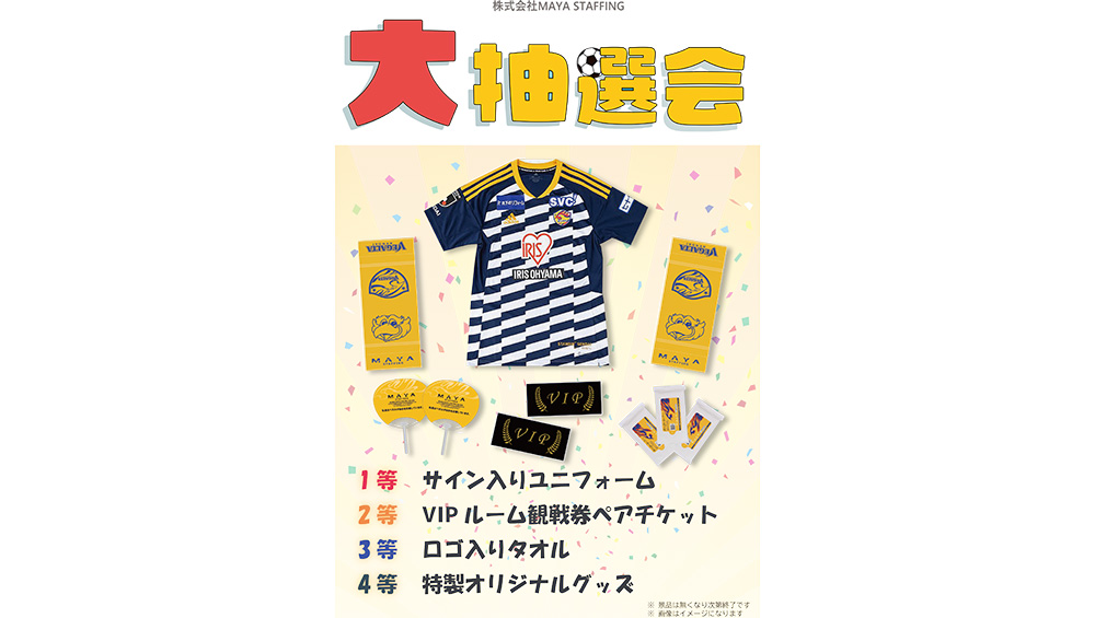 9月3日(土)、明治安田生命J2リーグ第34節 水戸ホーリーホック戦にて、シルバースポンサーのMAYA STAFFINGさまがLINE友だち追加者限定の抽選会ブースを出展いたします。2022選手サイン入りリミテッドユニフォームやVIPルーム利用権付きペア観戦チケット、オリジナルグッズなど豪華景品が当たる抽選会を実施します。