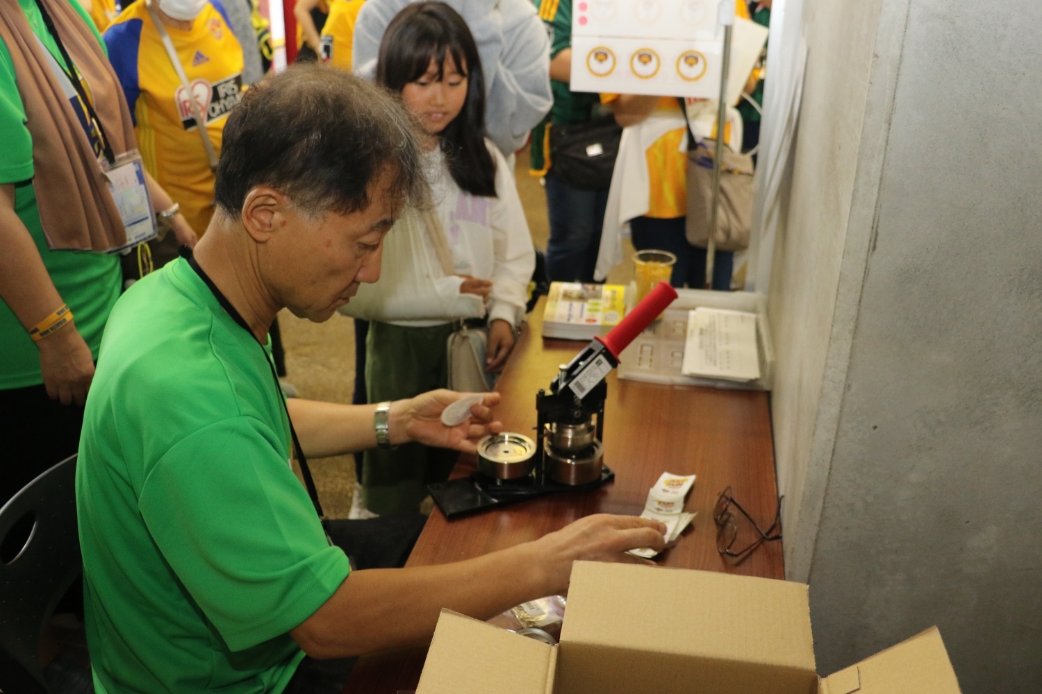 試合観戦の記念に缶バッチを作りましょう。ベガッ太デザインの缶バッチもございます。