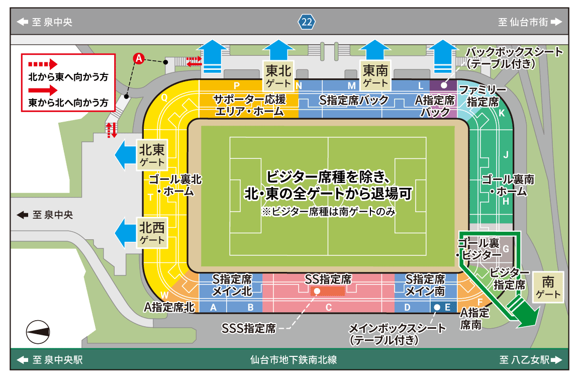 ビジター席種をお持ちの方を除き、北西・北東・東北・東南のすべてのゲートから退場いただけます。