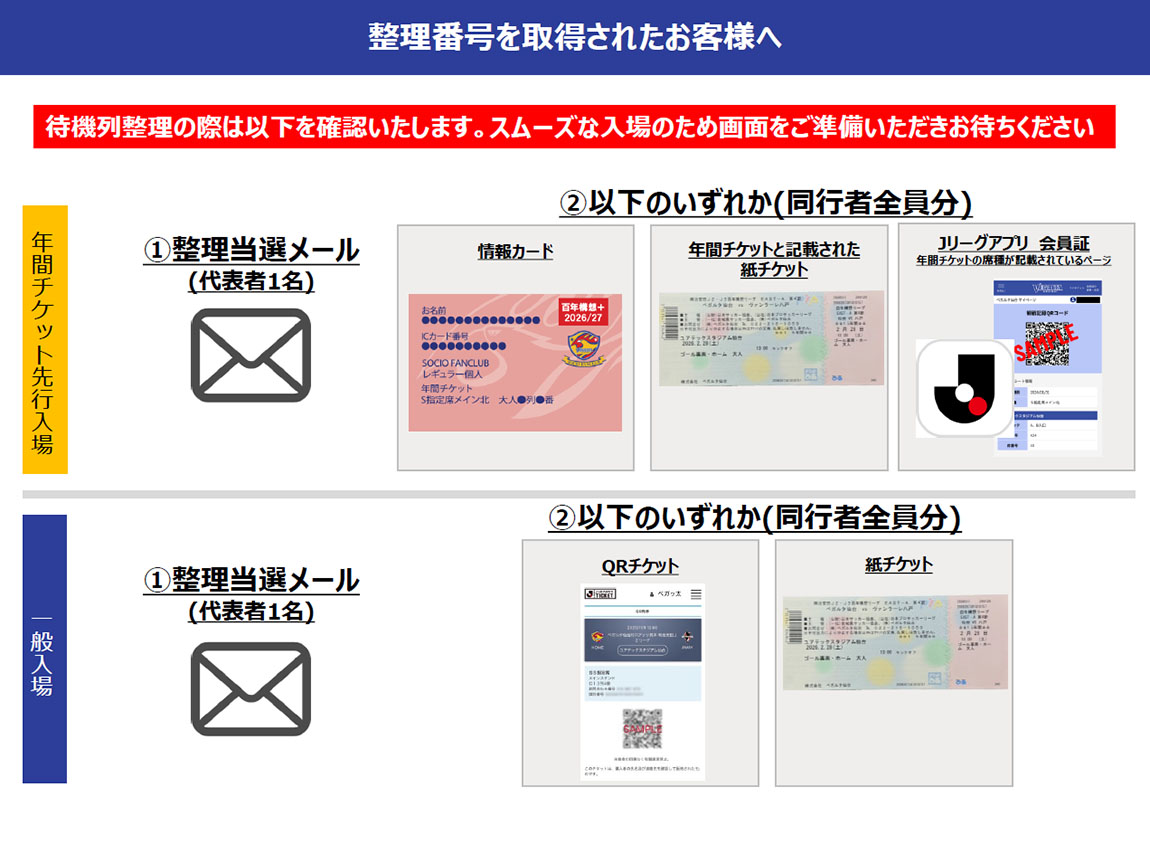【年間チケット先行入場】①代表者の整理番号当選メール ②同行者全員の情報カード/アプリ会員証など