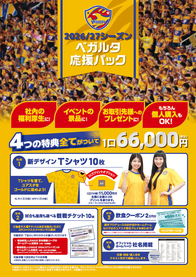 ベガルタ仙台は試合観戦をよりお得にお楽しみいただける「ベガルタ応援パック」を販売しております。観戦チケットやスタジアム内の飲食売店でご利用いただける飲食クーポンに加え、応援グッズとして、どなたでも気軽にご着用いただけるTシャツも付いており、スタジアムでの試合観戦にご活用いただけます。
