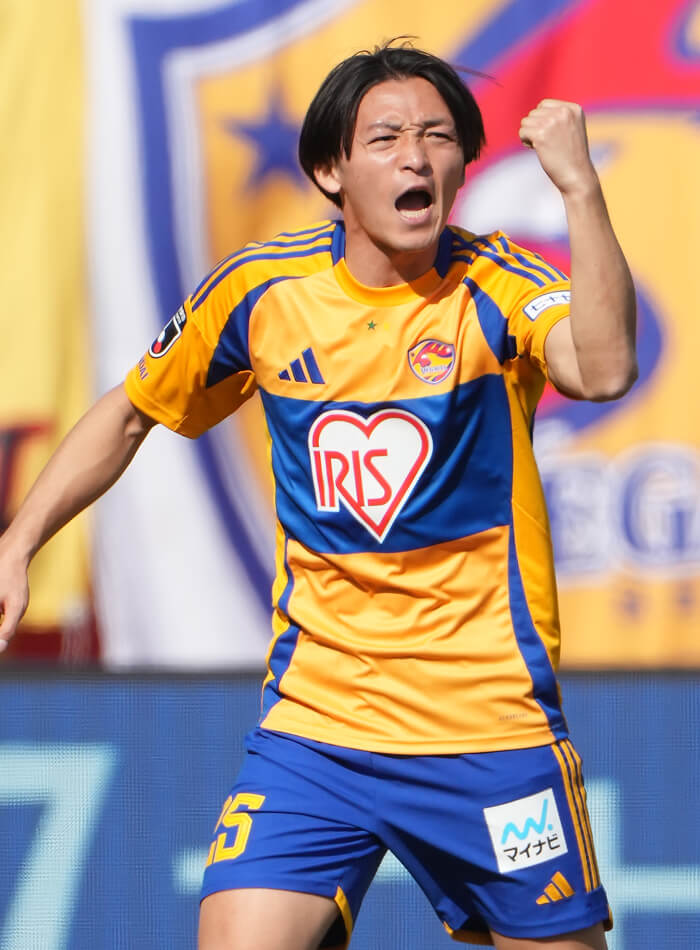 最後尾のGK1ニックマルスマンは大柄で手の届く範囲が広く、シュートコースをふさぐ。センターバックのDF4松田桂大とDF14下堂竜聖のコンビはいずれも人に強く、中央の守りは非常に堅い。さらに、奪ったボールをMF40成岡輝瑠らが素早く前線に供給し、それを受けるFW45山本桜大やFW19山本駿亮らFW陣も勢いよくディフェンスラインの背後を狙ってくる。相手の守備から攻撃への素早い切り替えを許さないことが、仙台には求められる。